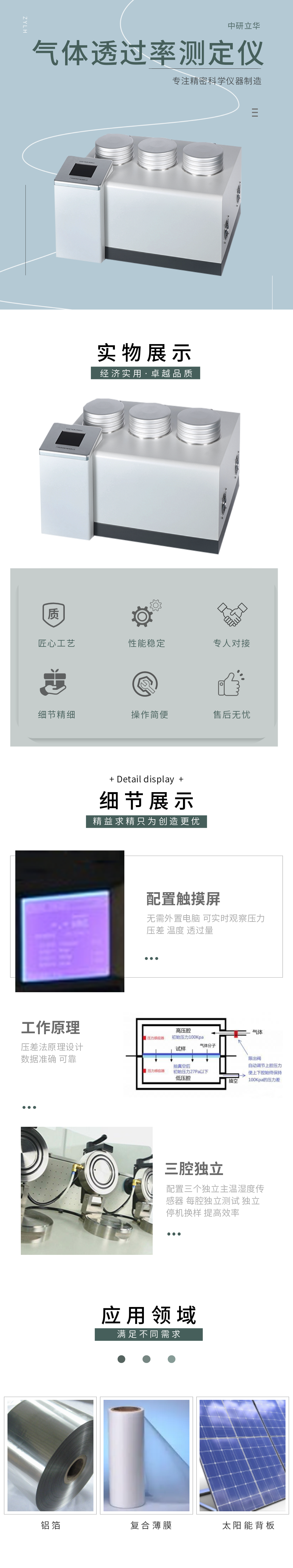 用途:測定薄膜或薄片材料的O2、CO2、N2等氣體的透過率(量)。適用于塑料薄膜、復合薄膜、鋁箔、鍍鋁膜等、各種片材、板材、橡膠、陶瓷等、包裝容器。廣泛應用于質檢、藥檢、科研、包裝等行業。