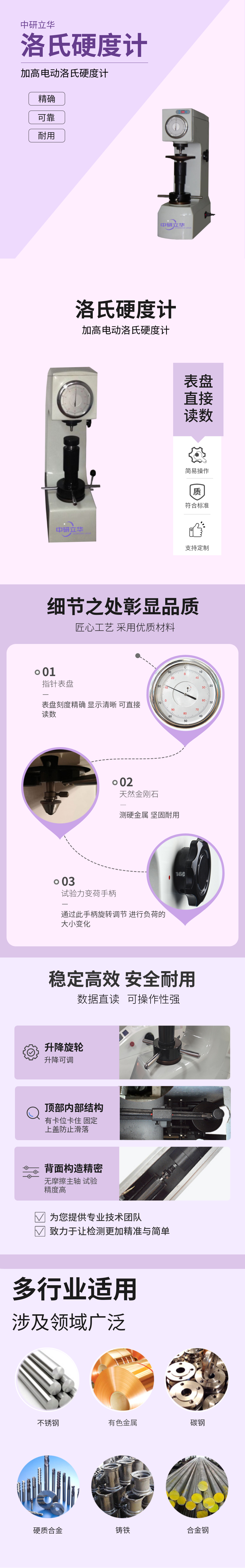 用途:適用于測定黑色金屬、有色金屬、非金屬材料的洛氏硬度,廣泛應用于淬火鋼、調質、退火鋼,冷硬鑄件,可鍛鑄件,硬質合金鋼,鋁合金,銅,軸承鋼、等材料的硬度測量。